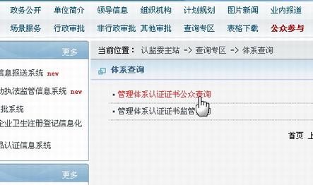 3、點擊“體系查詢”下“管理體系認證證書公眾查詢”字樣,進入正式查詢;